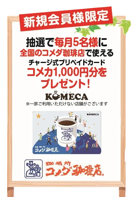 **「全国のコメダ珈琲店で使えるプリペイドカード『KOMECA(コメカ)』1,000円分」**を、抽選で毎月5名様にプレゼントいたします。
