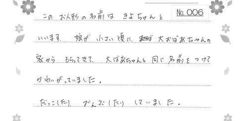 お人形にきよちゃんと名付け、大切にされていたのですね。