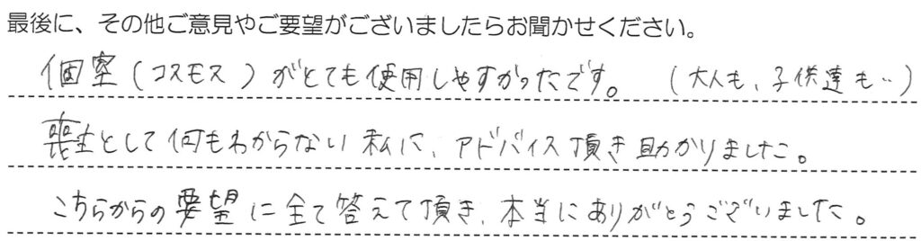 個室(コスモス)がとても使用しやすかったです。(大人も子供達も・・) 喪主として何もわからない私にアドバイス頂き助かりました。こちらの要望に全て答えて頂き、本当にありがとうございました。