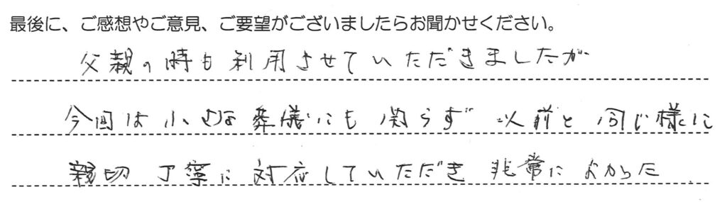 小さな葬儀にも・・・ 2025年12月11日 最終更新日時 : 2025年12月11日 sonia-hall 父親の時も利用させていただきましたが今回は小さな葬儀にも関らず以前と同じように親切丁寧に対応していただき非常によかった