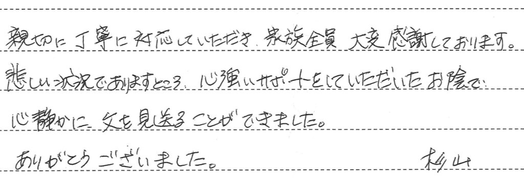 親切に丁寧に対応していただき、家族全員大変感謝しております。悲しい状況でありますところ、心強いサポートをしていただいたお陰で心静かに父を見送ることができました。ありがとうございました。 杉山
